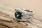 A Custom Three-Carat Green Sapphire and Three-Band Diamond Ring set in 14 Kt. White Gold